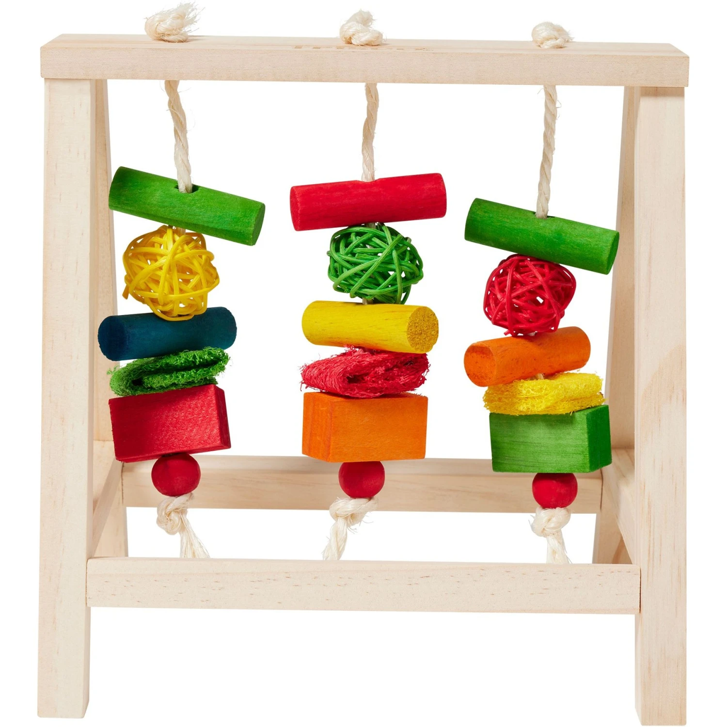 - This toy table has wooden posts and dangling kebab-like toys to entertain your pint-sized pet.