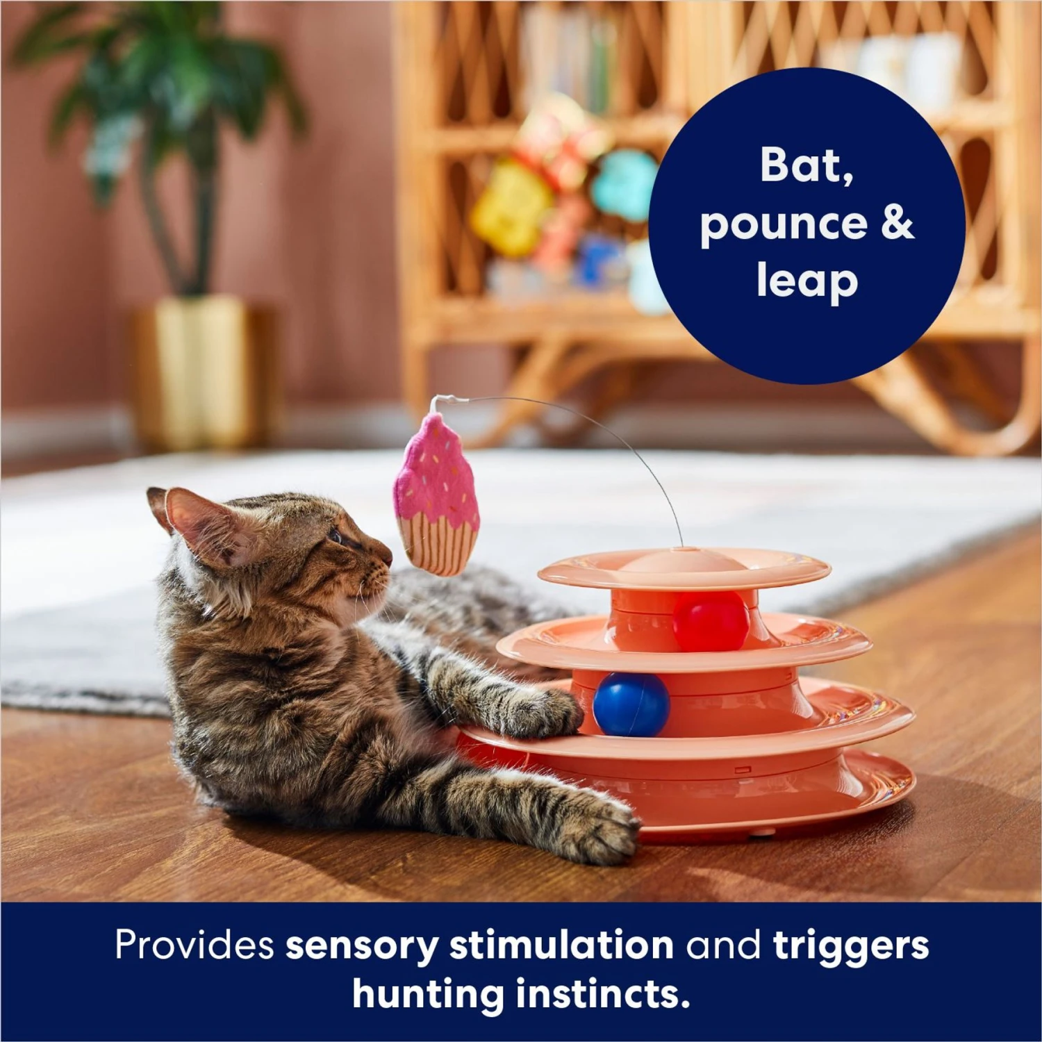 - The spinning action of the ball, rolling sound, and bouncy cupcake or candle on top keep cats engaged in play while nonstick pads keep the tracks in place.