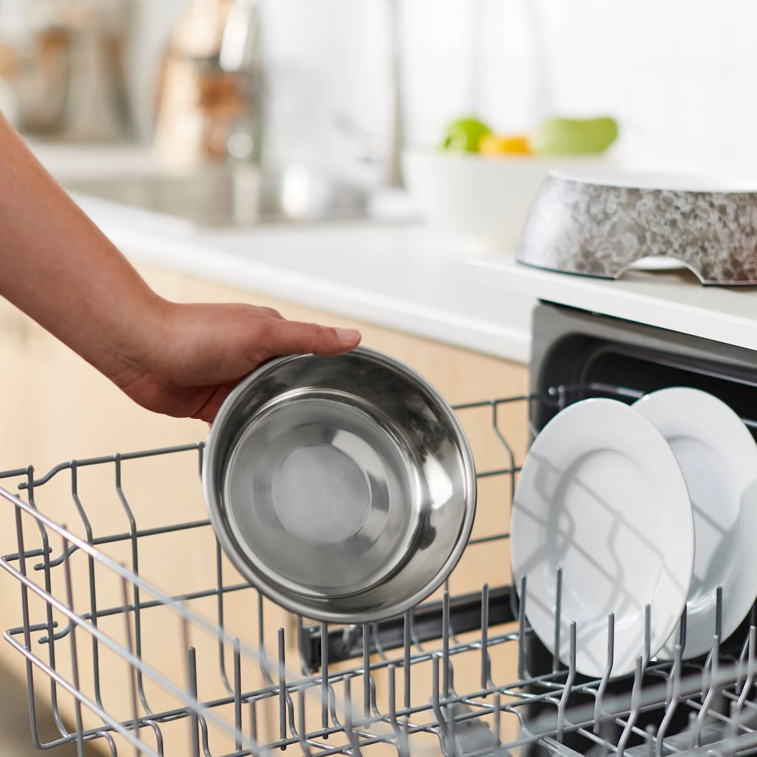 - Stainless-steel bowl comes out of the decorative base for easy cleaning.
