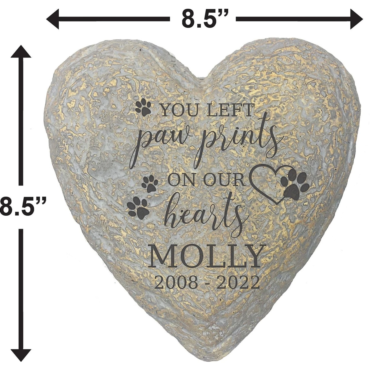 - Customize the stone with an engraving of your pet’s name and a date. Accompanying text says, “Paws on Our Hearts.”