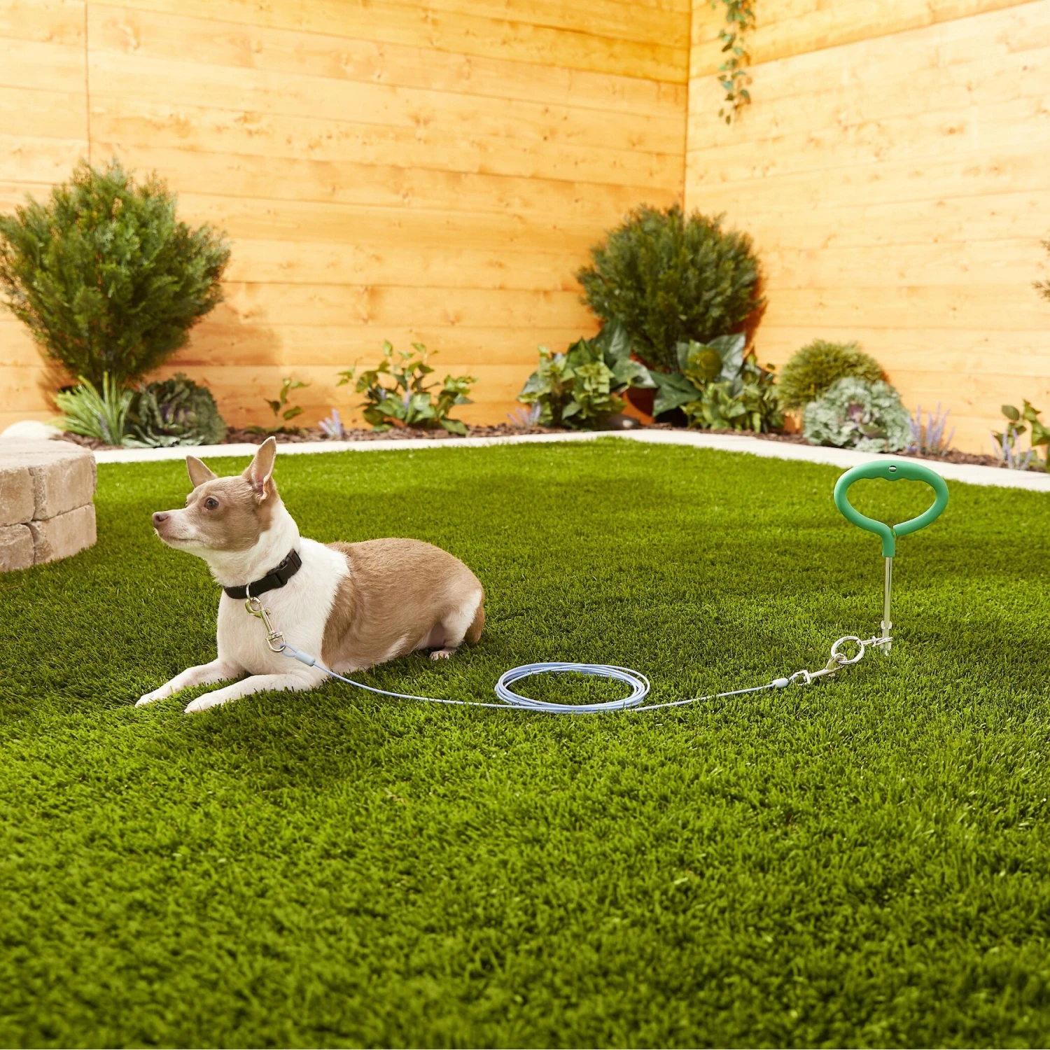 - Easy to use by clipping one of the metal swivel clips to your dog’s collar, and the other to a stake (not included).